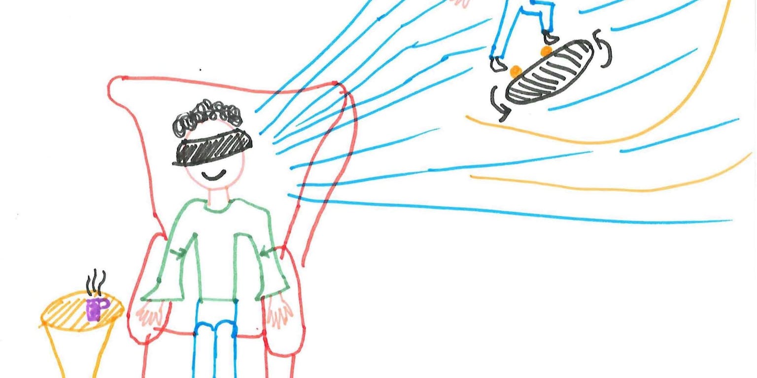Dat concludeert Hill ook als hij de tekening bekijkt waarop een man in een leunstoel tricks doet met een jongere avatar van zichzelf. "Zoiets als skaten lijkt me bijvoorbeeld erg lastig om na te bootsen”, geeft hij als voorbeeld van de limieten aan VR. “Sporten waarbij je weinig ruimte nodig hebt - zoals golfen of boksen - zijn wel goed te doen.” Met extra hulpmiddelen zoals een loopband is nog meer mogelijk. “Dan kan je niet alleen in een mooiere omgeving hardlopen, maar bijvoorbeeld ook urenlange virtuele wandeltochten maken.”