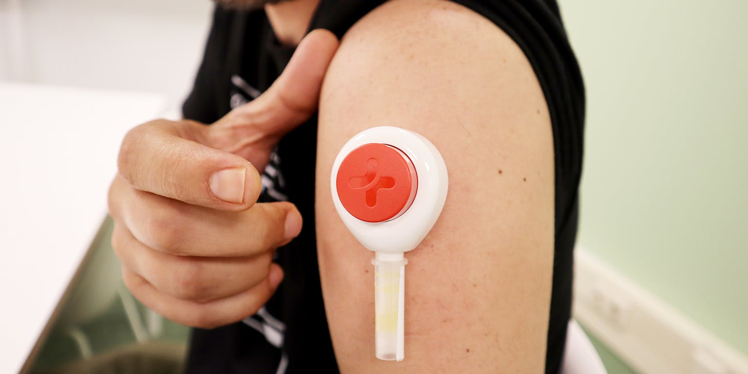 “Ik voel er niks van”, zegt eindredacteur Ilja van Dam in een vergaderzaaltje in het NEMO Science Museum. Op zijn linkerbovenarm zit een wit plastic blokje met een grote rode knop geplakt. Onderaan het apparaatje steekt een doorzichtig buisje ter grootte van een AAA-batterij uit. Van Dam heeft zojuist de grote rode knop ingedrukt. Die boorde zich als het goed is een weg naar een bloedvat. Binnen twee minuten zou het doorzichtige buisje zich moeten gaan vullen met bloed.