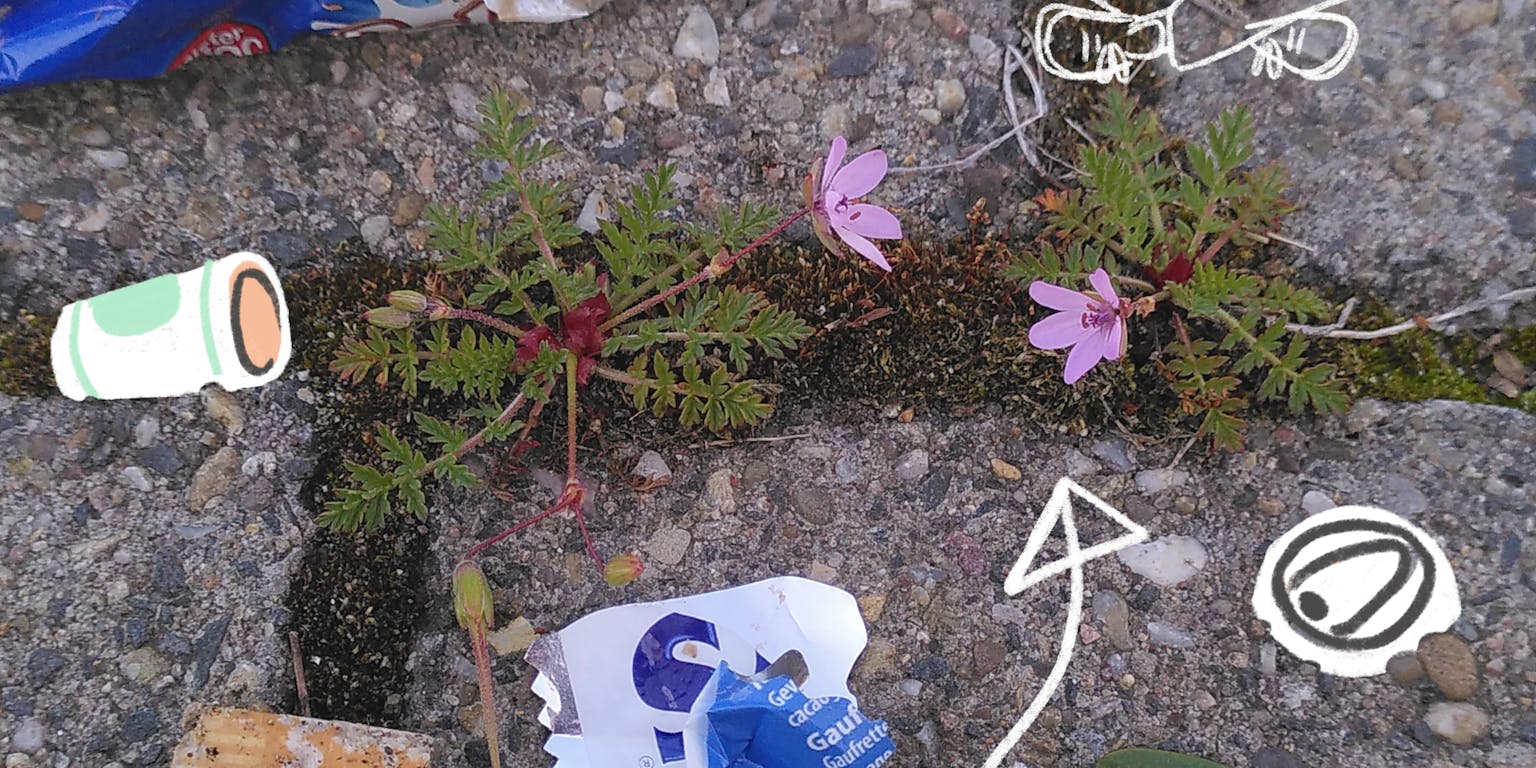 Ook stoepplantjes hebben te lijden onder het vele afval op straat, ziet onderzoekster Nienke Beets. Als we allemaal onze rommel opruimen, zou een plantje als de gewone reigerbek naast haar huis er vast fleuriger bij staan.