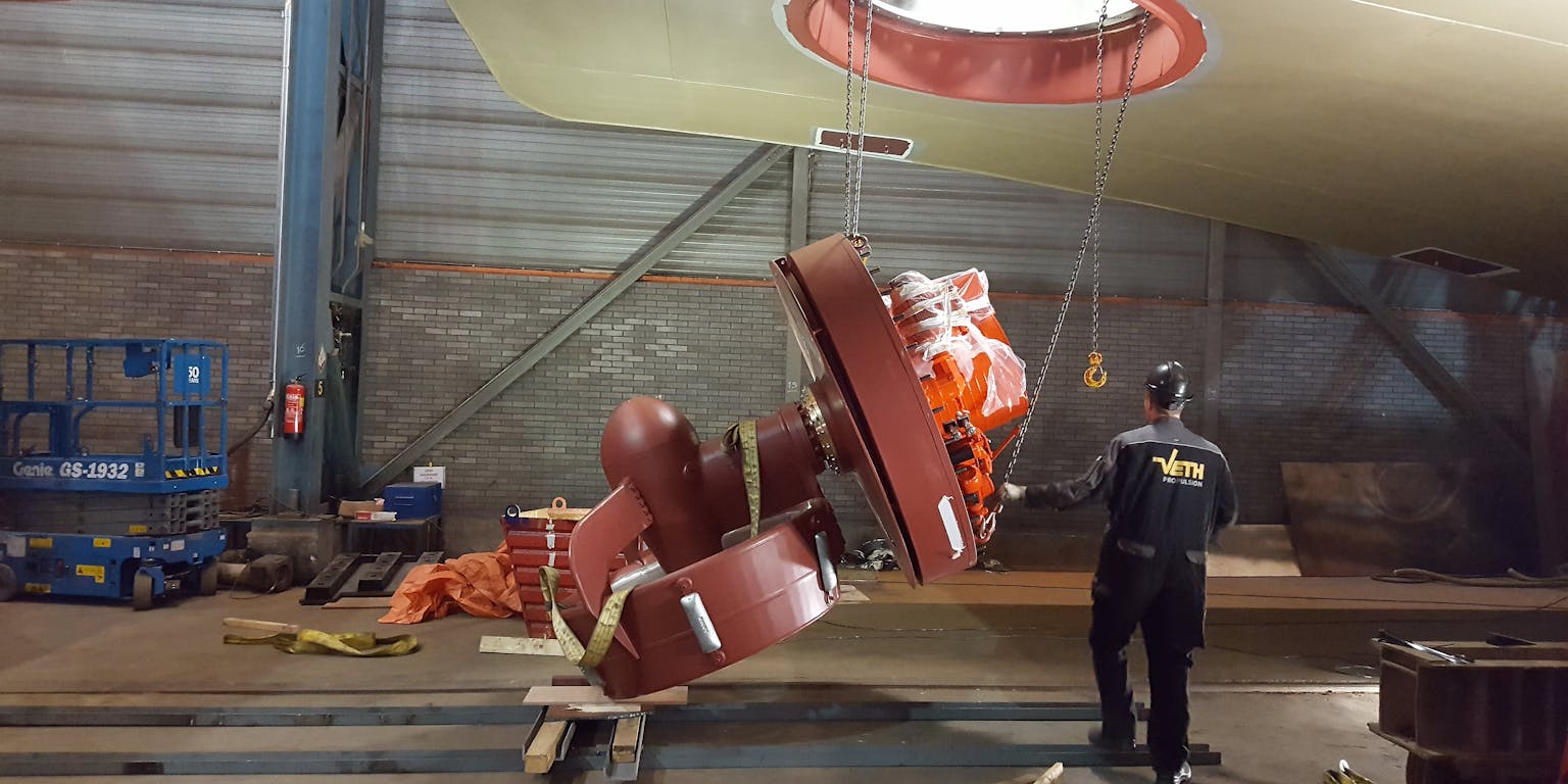 Om op dezelfde plaats te blijven, komt ook de roerpropeller Veth Integrated L-drive van pas. Die is zeer compact, waardoor het ook op plekken past waar maar weinig plek is. “Het hoogteverschil met reguliere modellen kan oplopen tot 2,8 meter. We hebben de roerpropeller in eerste instantie ontwikkeld voor een megajacht. Bij jachten zit er vaak een zwemplatform of een zwembad achteraan het schip. Meestal wordt daar ook de woonkamer vlakbij gemaakt. Daardoor is er weinig ruimte en komt een compacte roerpropeller van pas”, legt Marco Huisman van Veth Propulsion uit.