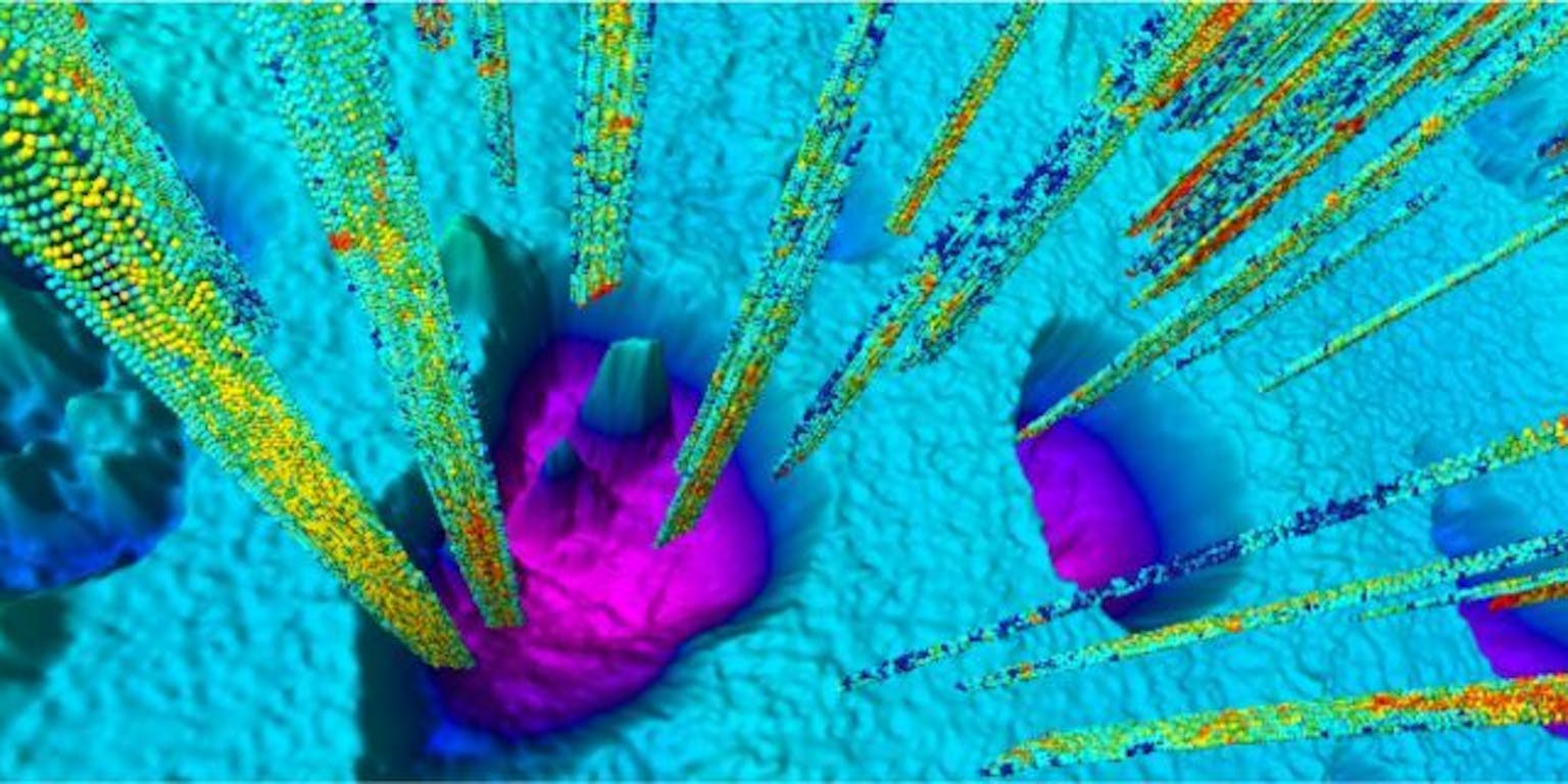 De kraters, met daasronder de “schoorstenen” waar het gas door omhoog kwam. Nog altijd lekt er gas de zee in (dat zijn de verticale oranje “stekels” in het plaatje).