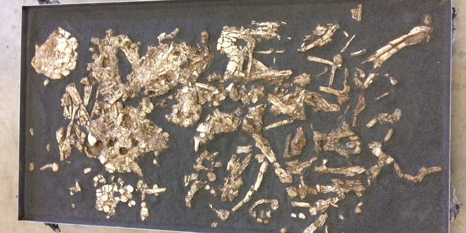 Schoonmaak prehistorisch graf Tiel in atelier van Archeocare. Het graf lag oorspronkelijk vlak onder het maaiveld. Door overstromingen kwam een 1,5 meter dikke kleilaag over het graf te liggen. Dit zorgde ervoor dat de botten beschermd werden, maar door het gewicht van de klei zijn de botten samengeperst en gebroken.