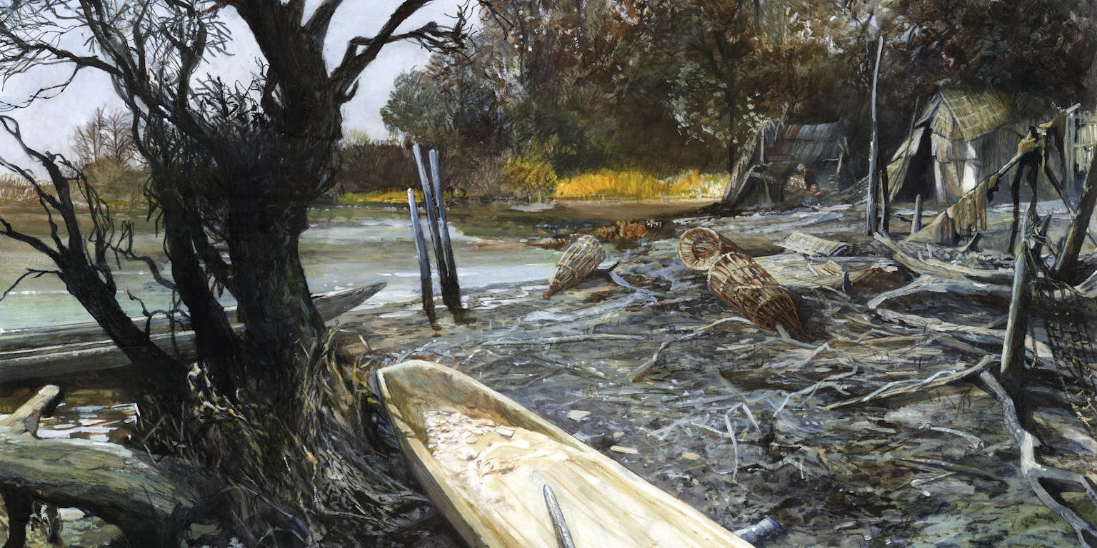 Het natte westen van Nederland bleek een veel aantrekkelijker gebied voor bewoning te zijn geweest dan aanvankelijk werd gedacht. Er was veel voedsel en op de hoge, droge rivierduinen had men een goed uitzicht over het jaaggebied. Mensen trokken rond met kano’s en leidden een nomadisch bestaan. Op de foto een kamp van jagers en vissers; de oever is bereikbaar gemaakt door het riet te verbranden. Van verbrand riet zijn fossiele resten gevonden.