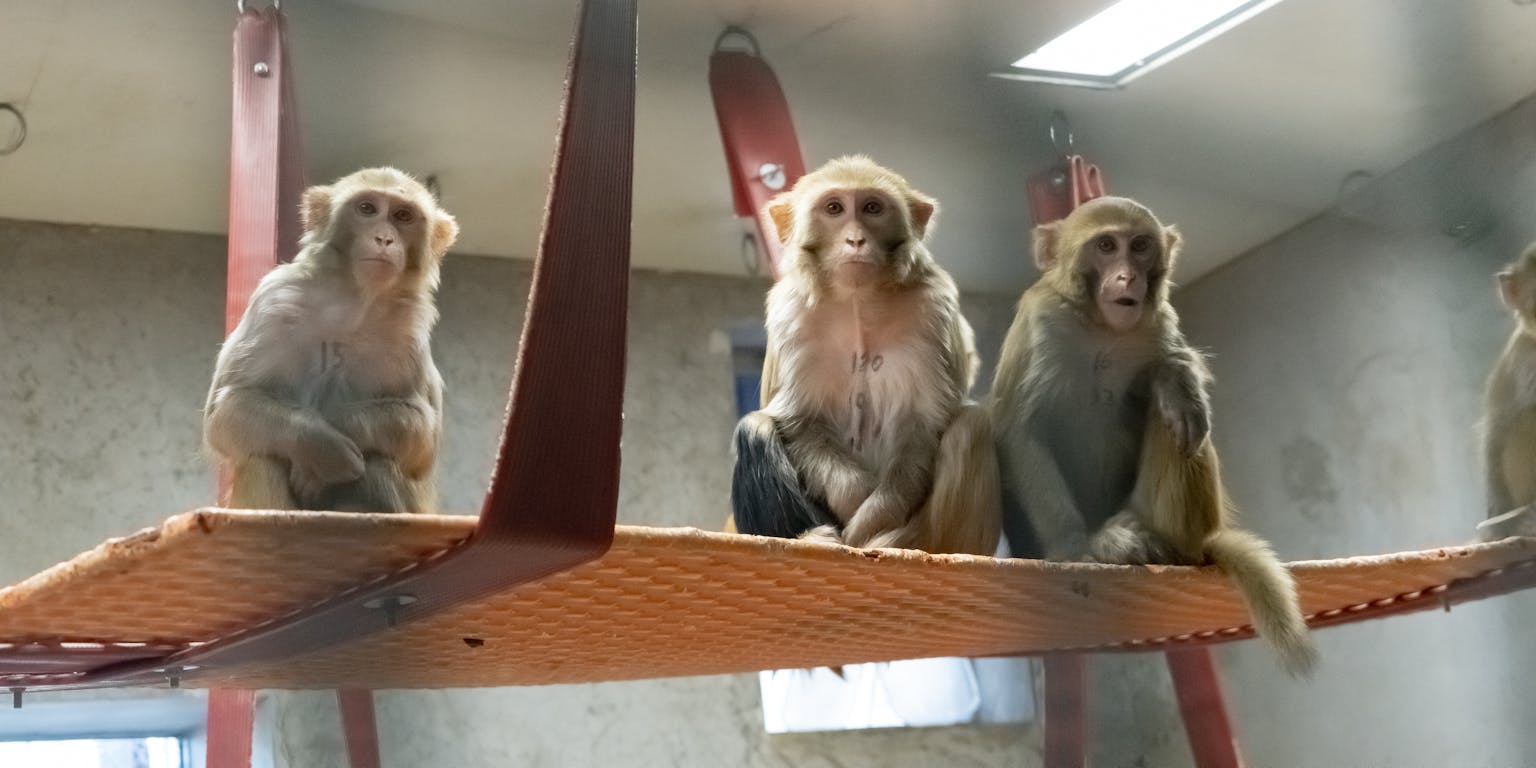 Adjunct-directeur Jan Langermans en onderzoeker Babs Verstrepen leiden me rond bij de fokfaciliteit van het BPRC. De resusapen komen meteen kijken.