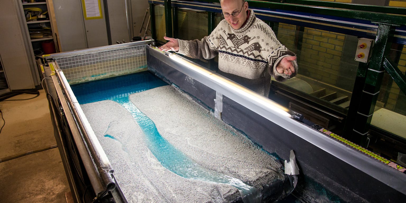 Professor Water en Zand noemt hij zichzelf: Maarten Kleinhans, die vandaag zijn oratie hield aan de Universiteit Utrecht. Over het nabootsen van rivieren met schaalmodellen en de noodzaak van creativiteit in de wetenschap.