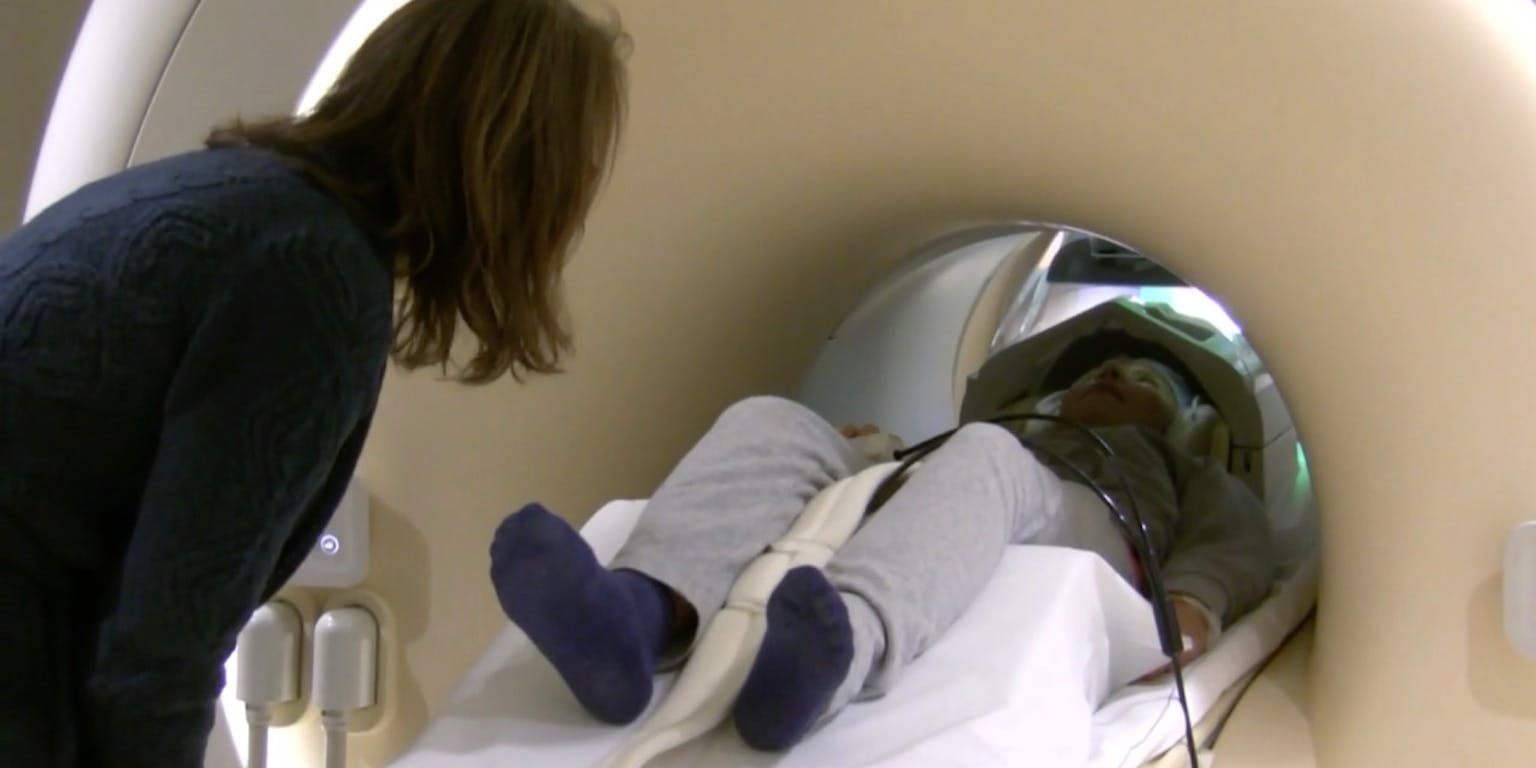 Braams tijdens haar onderzoek. Eén van de deelnemers ligt in de MRI-scanner om een taakje uit te voeren terwijl de hersenactiviteit wordt gemeten.