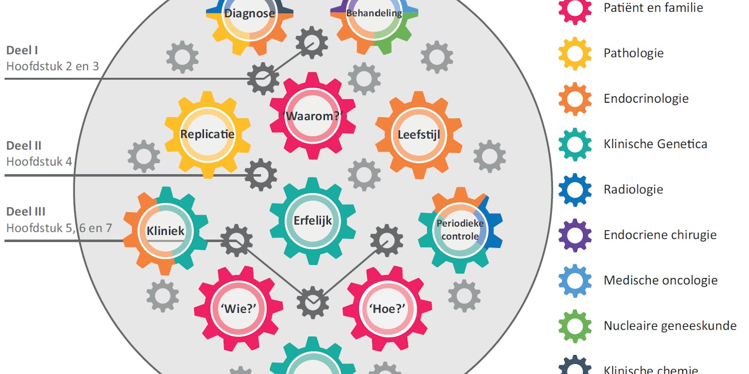Op dit moment zijn vijf studies afgerond en gepubliceerd in een wetenschappelijk tijdschrift. Met de laatste studie ben ik nog bezig. Deze studie gaat over de erfelijke aanleg van schildklierkanker bij kinderen (zie filmpje). Om die zes hoofdstukken heen heb ik een algemene introductie en discussie geschreven. Dat was een behoorlijke uitdaging omdat de onderwerpen van de studies best ver uit elkaar lagen. Door de vragen van patiënten centraal stellen is het gelukt om alle puzzelstukjes samen te voegen. Zoals je kunt zien in onderstaande afbeelding waren daar veel verschillende medisch specialisten bij betrokken.