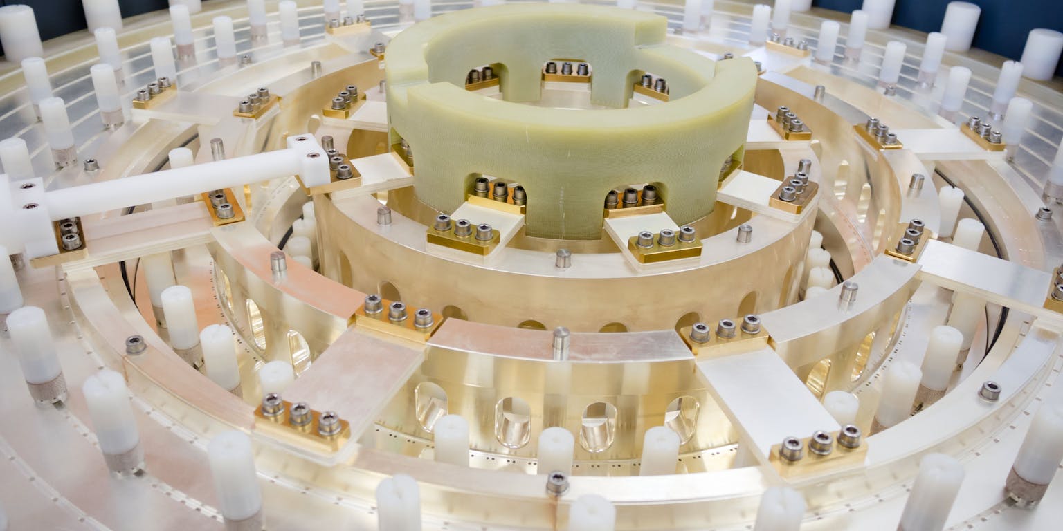 De elektromagneet in aanbouw. De spoel bestaat uit metalen platen (direct om de persoon heen) die in een stalen vat zijn geplaatst. Aan de zijkant zijn de aansluitingen zichtbaar voor het koelwater.
