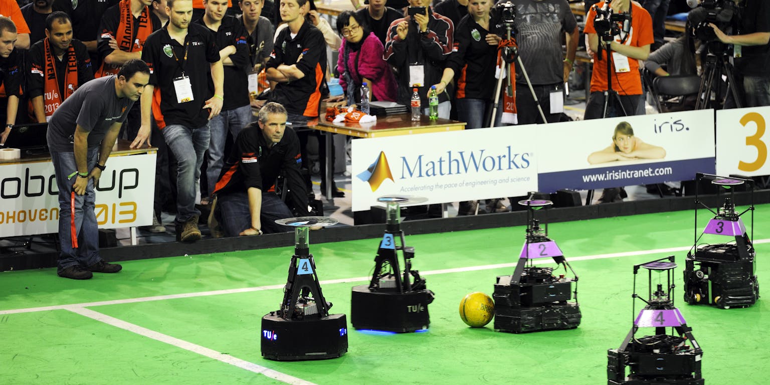 Beelden van een robotvoetbaltoernooi in Portugal eerder dit jaar, dat Tech United won.