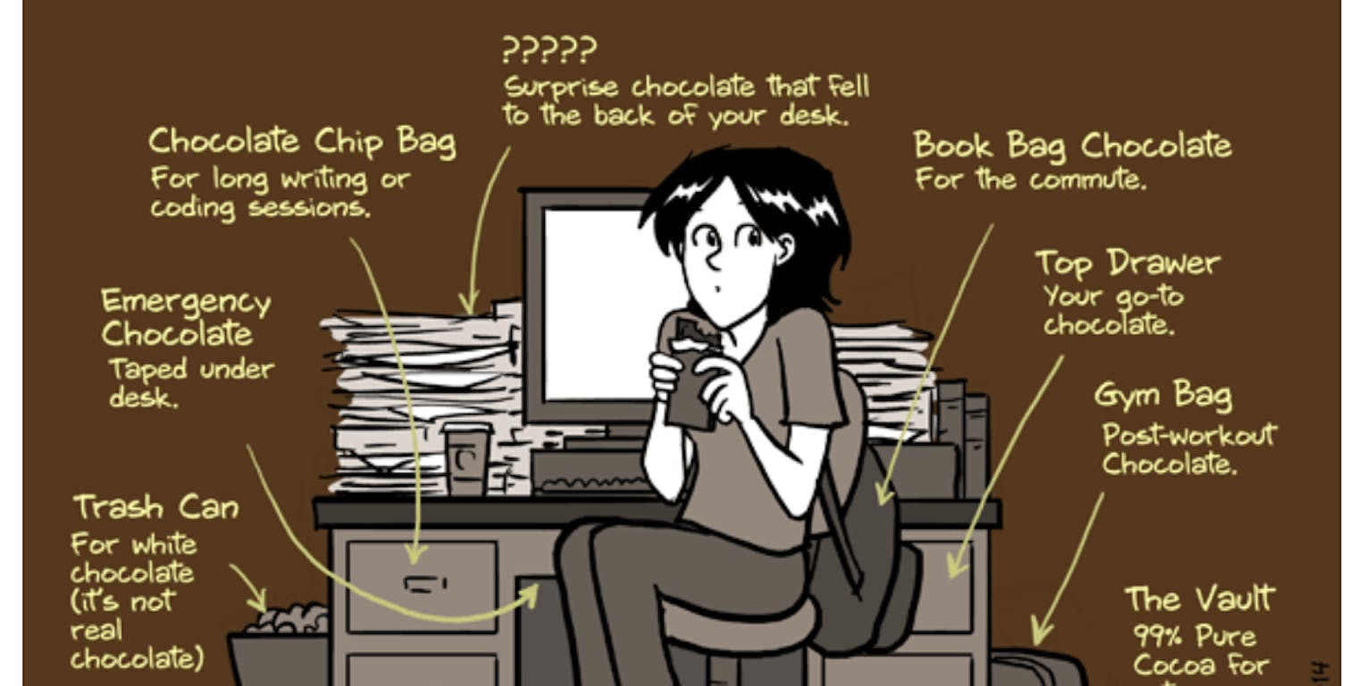 Dit is hoe het in werkelijkheid gaat: Mijn familie komt op bezoek en neemt een grote doos koekjes en een zak spek mee. Dat is wel ‘gevaarlijk’, maar ik weet ze toch zeker één week te weerstaan. Ach, eentje af en toe is niet erg, toch? Met een beetje discipline houdt je het eigenlijk best vol, zo’n healthy lifestyle. Behalve dan op die paar alles-gaat-mis-dagen. Laatste experimenten die fout zijn gegaan, belangrijke bestanden die ik per ongeluk overschreven heb, documenten die plotseling niet meer openen… Starend naar het computerscherm met mijn handen in mijn haar besluit ik op zulke momenten dat ik best een beetje lief voor mezelf mag zijn. Die grote zak spek ligt inmiddels naast me op mijn bureau, je moet je energie toch ergens vandaan halen?! Nog geen vijf minuten later sta ik in de supermarkt: ‘Even eruit’ om toch maar die grote reep chocolade te scoren.