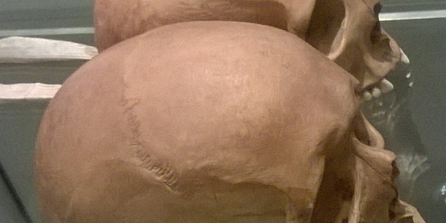 Twee schedels van afgeslachte Romeinen liggen in een vitrine. Een mooi versierde officiersdolk ligt ernaast. Deze vondsten zijn afkomstig uit een waterput van het Romeinse fort bij het Noord-Hollandse Velsen. Dit fort, inclusief haven aan de noordelijkste monding van de Rijndelta, moest de kust bewaken tegen ‘barbaarse’ indringers vanuit het noorden en vanaf zee.