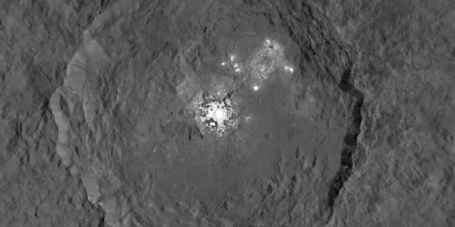 Wat te denken van de mysterieuze witte vlekken die op verschillende plekken aan het oppervlak van de 950 kilometer grote dwergplaneet te zien zijn. Het helderst zijn de vlekken midden in een grote krater genaamd Occator. Op geen ander hemellichaam zijn zulke heldere plekken te zien (behalve misschien de polen op aarde) en wetenschappers kunnen tot nu toe enkel speculeren over wat het is.
