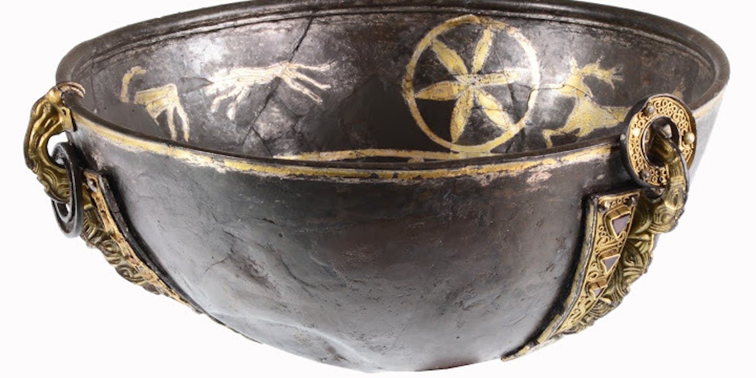 De van oorsprong zilveren schaal is te dateren rond 400 na Christus en komt uit Oost-Europa (of nog verder richting het oosten). Twee eeuwen later is de schaal rijk versierd met gouden beschilderingen, rode halfedelstenen en vergulde beslagplaten met een ophangsysteem. De gouden schijf op de bodem en de beslagplaten doet denken aan eerdere vondsten in het Duitse Rijnland uit het begin van de zevende eeuw maar het ophangsysteem aan twee ringen aan Engelse of Scandinavische invloeden.