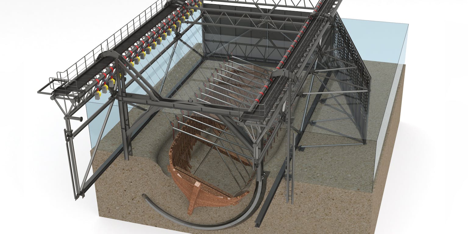 Een impressie van de lichtingsconstructie van de IJsselkogge. Met een zogenoemde spuitlans (de gebogen buis) worden hijsbanden onder het wrak doorgetrokken. Daaraan wordt het wrak uit de bodem gelicht. Klik hier voor een video van de berging.