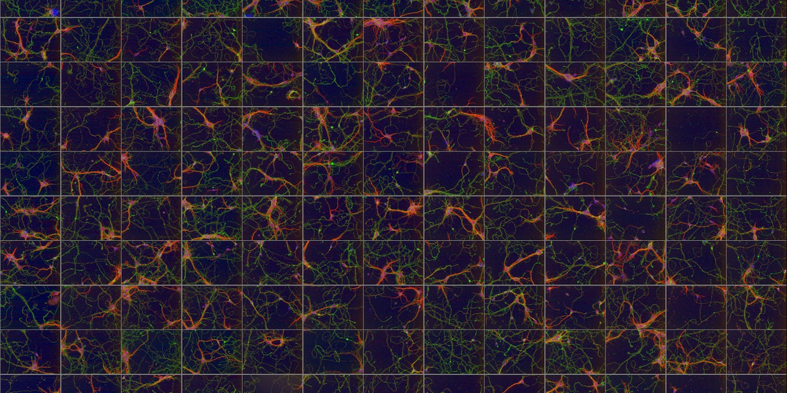 Een overzicht van neuronen die in vitro zijn gekweekt om ze te testen. Omdat ze aangekleurd zijn kan de computer ze herkennen.