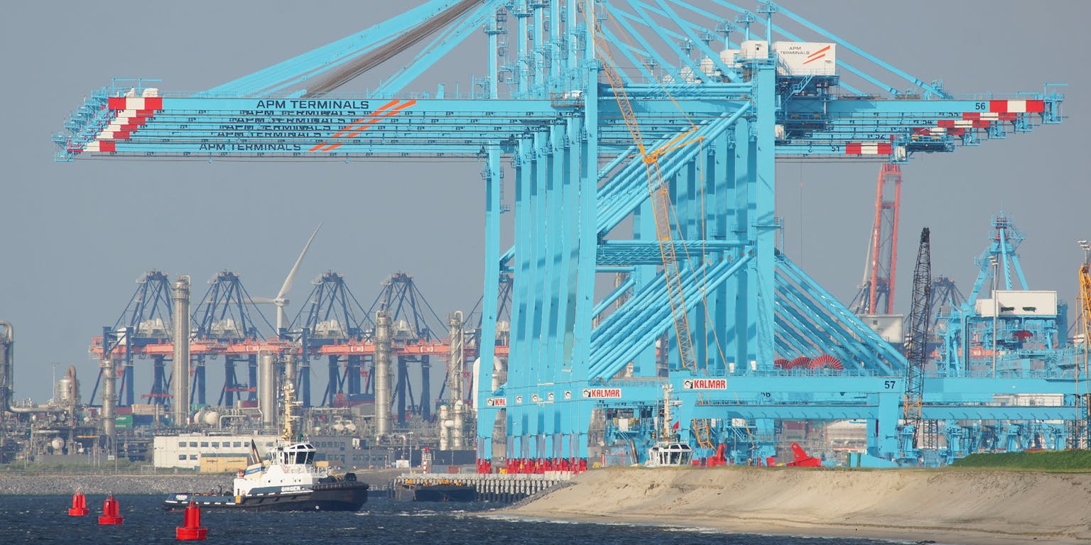 De kranen van de APM Terminal in de haven van Rotterdam worden op afstand bestuurd door ‘operators’. De terminal zit op de Prinses Amaliahaven van de Tweede Maasvlakte.