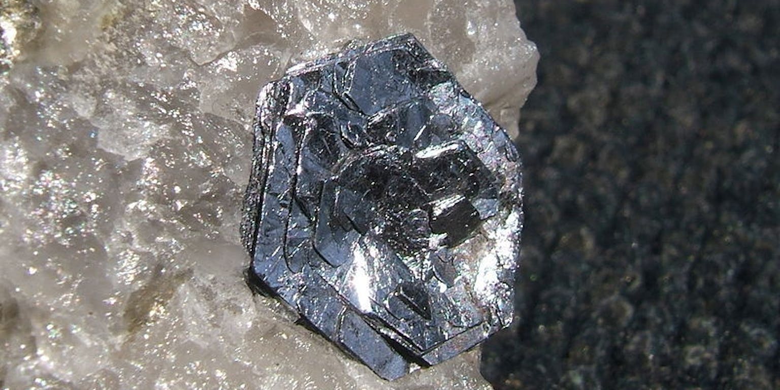 Molybdenietkristal (van 15 mm) op kwarts, uit de Molly Hill-mijn, Quebec, Canada.