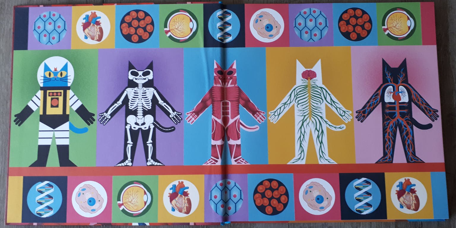 De EenhoornWat als eerste opvalt aan ‘Professor Astrokat – Reis door je lijf’ is de enorm kleurrijke en vrolijke kaft. Ook de binnenflap is rijk versierd met prenten van Ben Newman. Dit maakt het boek erg aantrekkelijk en nodigt uit om verder te gaan kijken.