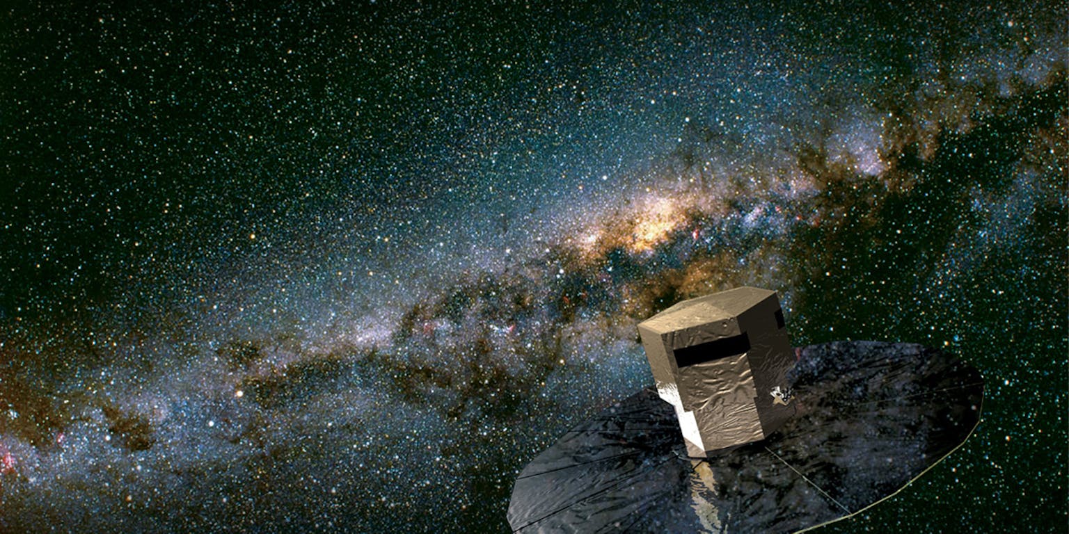ESAOp 1,5 miljoen kilometer van de aarde is het rustig. Daar, op ongeveer vier keer de afstand tot de maan – om het zogenoemde tweede Lagrangepunt – beweegt sinds vorig jaar heel stilletjes de Gaia-satelliet. De missie: de grootste inventarisatie ooit van sterren in de reusachtige Melkweg maken, die naar schatting honderden miljarden sterren bevat. Gaia gaat er daarvan ruim een miljard spotten, en bepaalt daarbij onder andere de afstand, de beweging, de helderheid en het soort licht dat ze uitstralen.