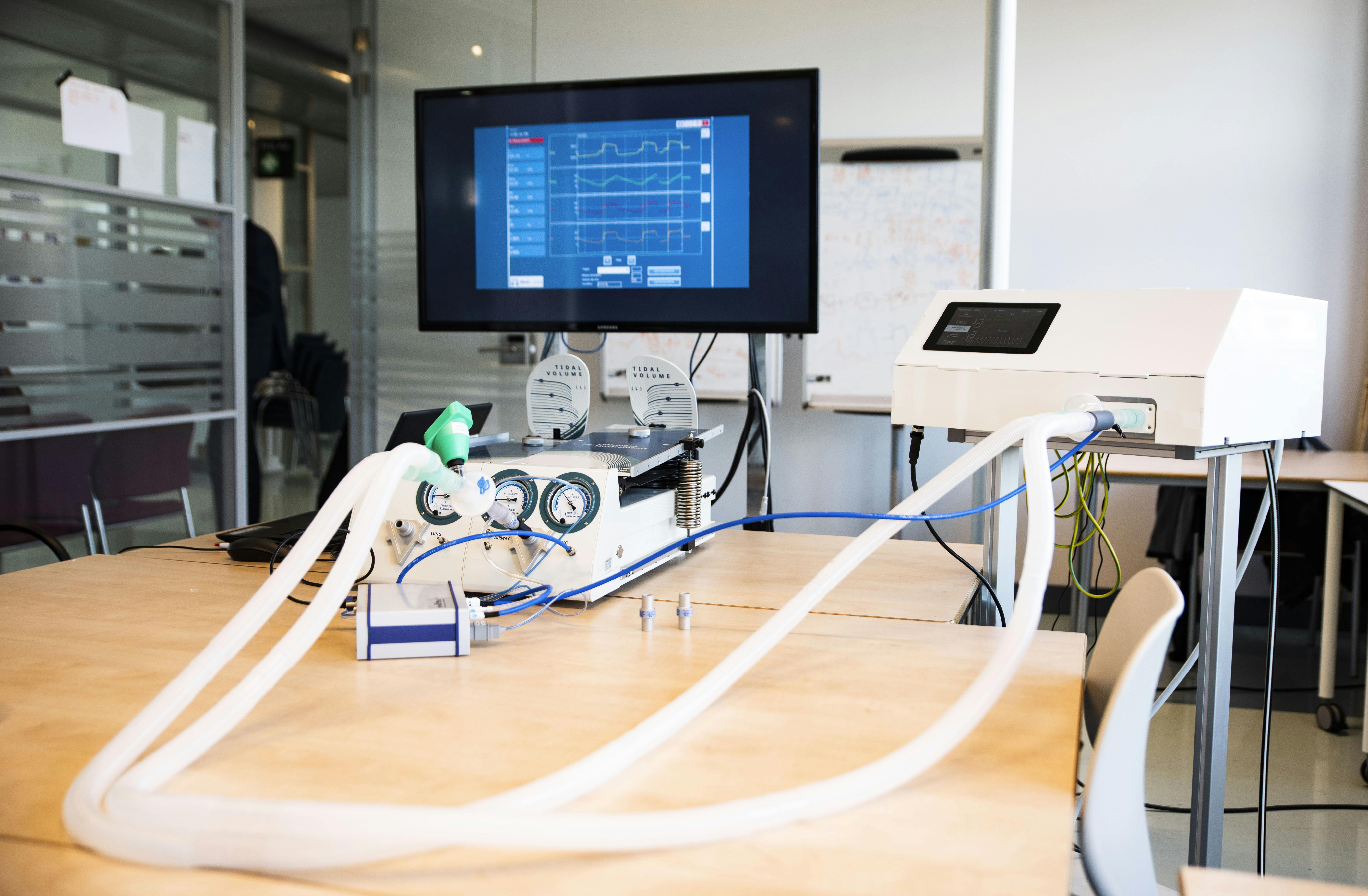 Het beademingsapparaat van de TU Delft aangesloten op een kunstmatige long, tijdens een van de tests.