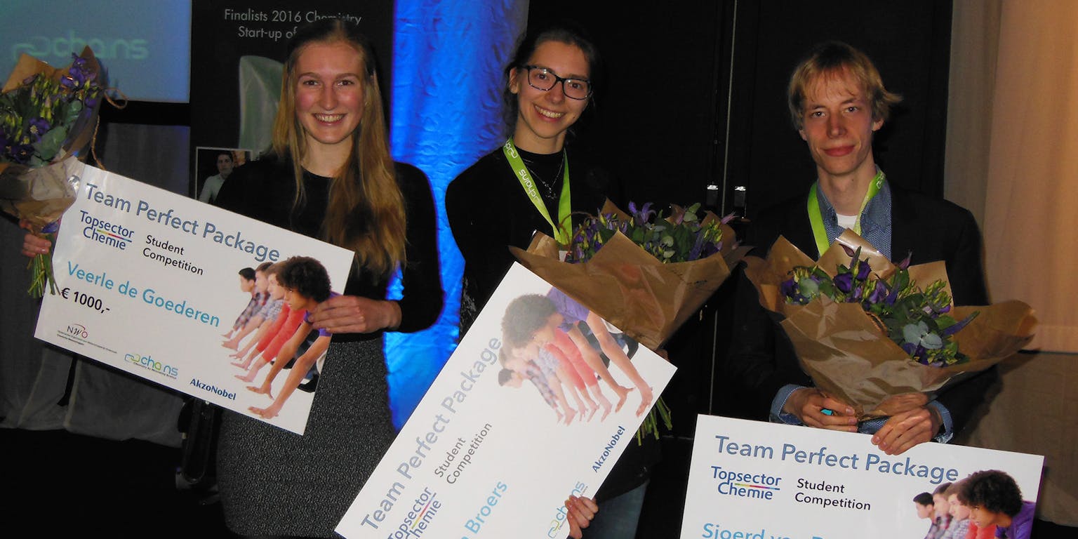 Die potentie benadrukt ook de jury van de Topsector Chemie Studentencompetitie, een wedstrijd voor masterstudenten die onderzoek naar sociaal- of industriegerelateerde vraagstukken promoot. Begin dit jaar dienden de studenten als team Perfect Package een onderzoeksvoorstel in bij deze wedstrijd. Ze behoorden tot een van de vier geselecteerde teams die hun voorstel daadwerkelijk uit mochten voeren. De hele zomer werkten ze hard aan hun onderzoek, een verslag en een presentatie. Al dit harde werk werd beloond met de winst, een cheque van duizend euro per persoon, uitgereikt op CHAINS 2016. “Waarschijnlijk hebben we gewonnen omdat ons onderzoek maatschappelijk relevant was”, denkt De Goederen. “En het onderzoek was geslaagd.”