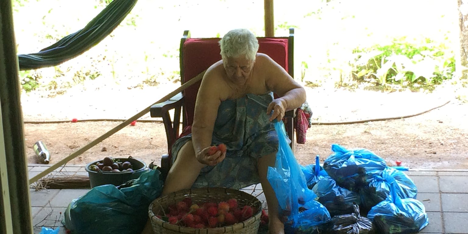 Oma bezig fruit uit te zoeken
