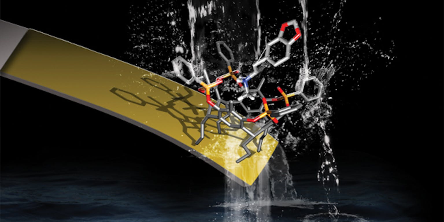 Ze plaatsten de receptoren op het oppervlak van een microscopisch kleine springplank van silicium. Komt de sensor in water in contact met een methamfetamine molecuul? Dan buigt de piepkleine springplank door. Het is een piepkleine beweging, op microschaal, maar met een speciaal soort laser is de beweging goed op te pikken.
