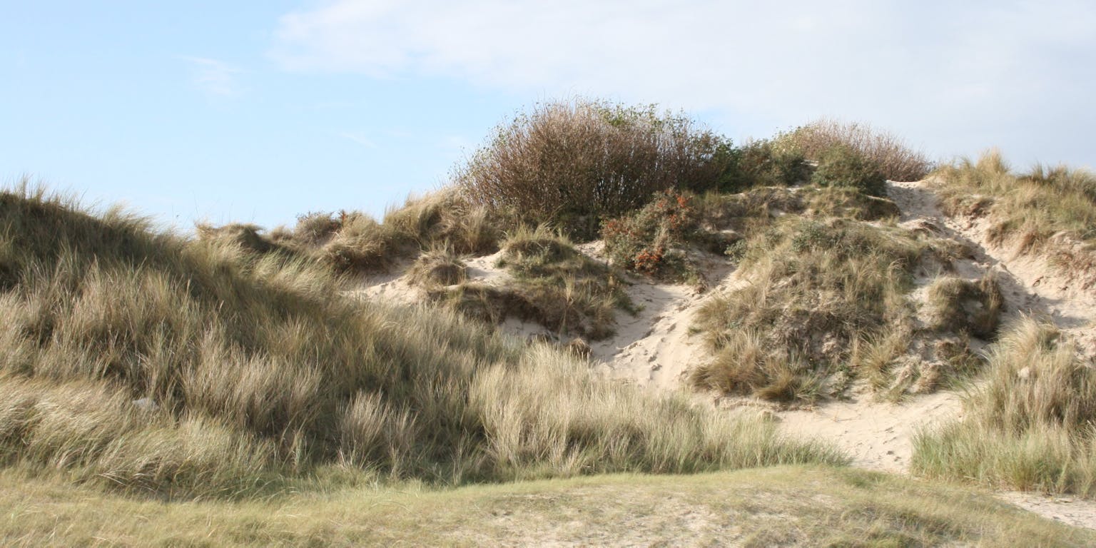 Zicht op de Zanddijk: de duinenrij oostelijk van De Slufter. De maximale breedte van De Slufter van 400 meter is afgestemd op de sterkte van deze duinenrij, die op dit moment in opdracht van het waterschap opnieuw wordt vastgesteld. Onderzocht wordt of de beweging van de kreek beperkt moet worden, of dat de natuur hier met behoud van de veiligheid haar eigen weg mag zoeken.