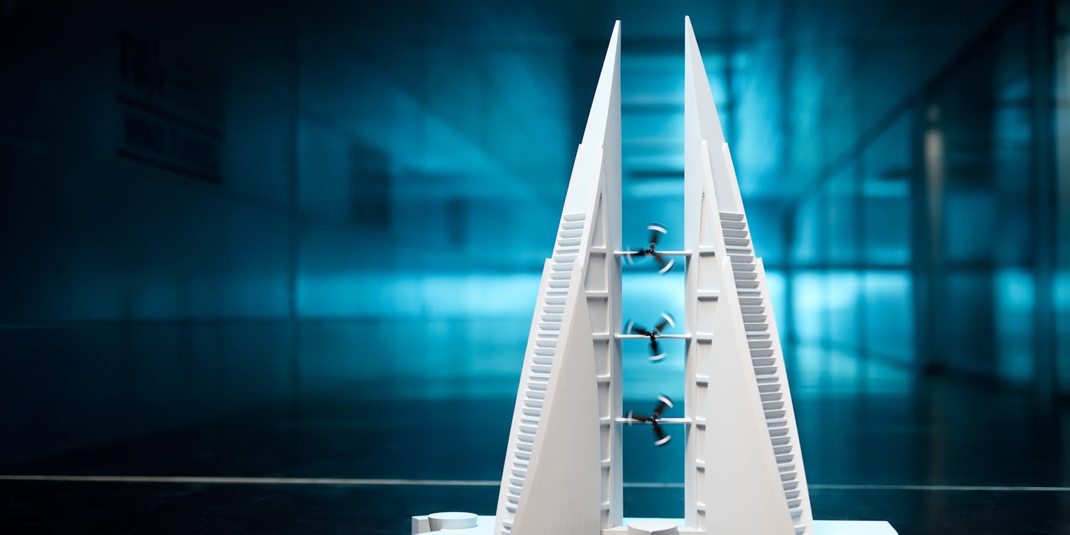Model van het in werkelijkheid 240 meter hoge Bahrain World Trade Center in de windtunnel van de Technische Universiteit Eindhoven. Uit onderzoek bleek dat de geïnstalleerde windturbines bij een andere oriëntatie van de torens op jaarbasis veertien procent meer energie zouden opwekken.
