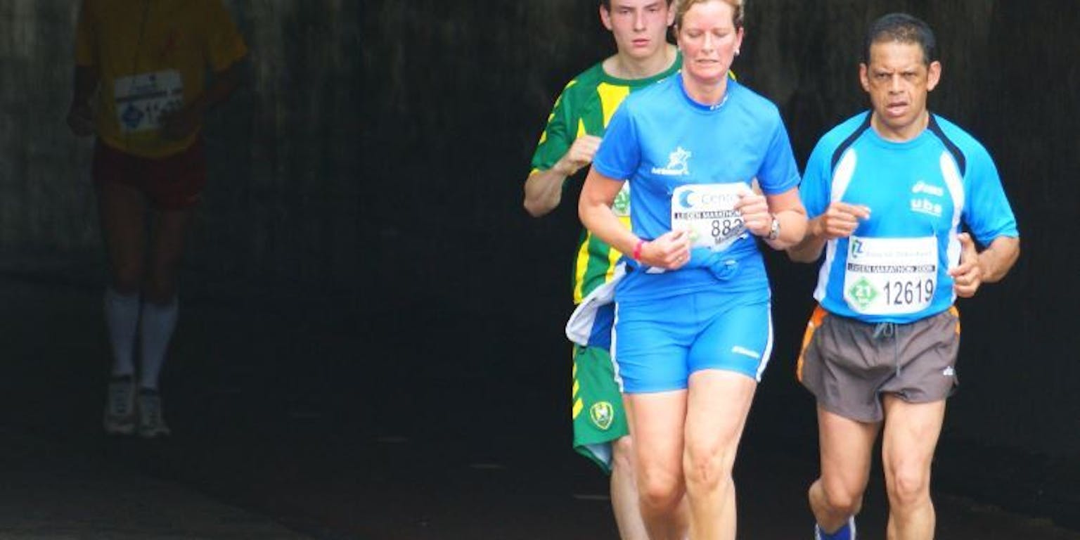 De spieren van deze deelnemers aan de Leidse marathon zijn zo te zien door hun suikerbrandstof heen, en zijn overgeschakeld op vetverbranding, wat minder efficiënt is.