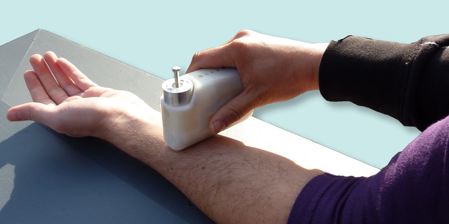 “Deze RevoltST geeft de wrijvingswaarde weer. Bijvoorbeeld van een badkamertegel. Je wilt niet dat iemand daarover uitglijdt. In de RevoltSt wordt een stukje materiaal, bijvoorbeeld van de tegel, geplaatst. Vervolgens wordt het wieltje aan de onderkant van het apparaat op de huid geduwd. Krachtsensoren meten dan hoeveel weerstand het wieltje ondervindt en tonen de weerstandswaarde.”
