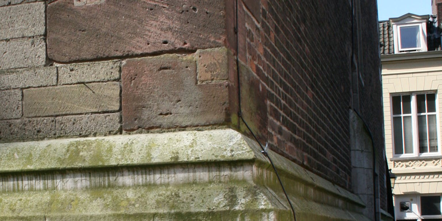 Schelpenfossielen uit de Jura in bouwblokken van Portland kalksteen in de Domtoren. De schelpen liggen horizontaal, met hun bolle kant naar boven. Voor geologen is dit fossielrijke gesteente een aanwijzing van een afzetting in ondiep water.