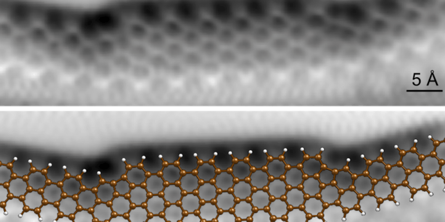 Een lint van grafeen gezien door een zogenoemde atomic force microscope (boven). In het onderste plaatje is de structuur van grafeen er overheen getekend. Het stuk van vijf atomen breed is geleidend, het stuk van zeven atomen breed is halfgeleidend.