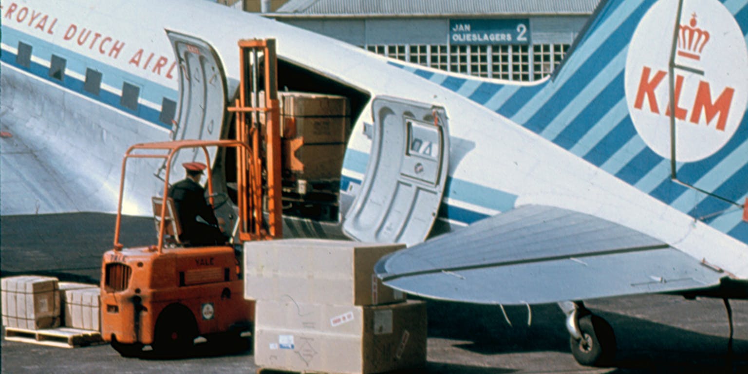 Propellervliegtuig type DC-3 van KLM. Niet lang daarna ging KLM investeren in straalvliegtuigen.