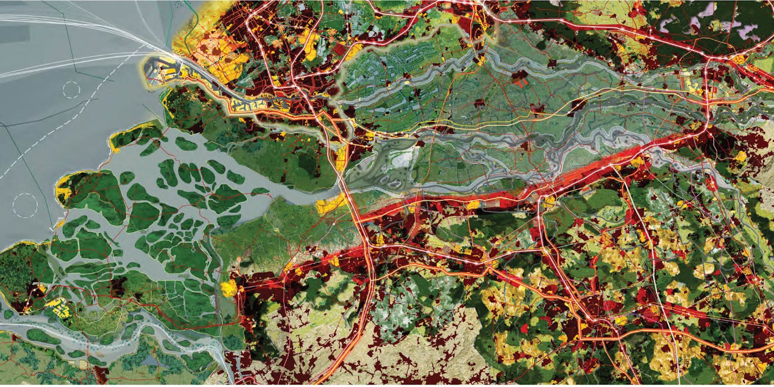 Deze stedenbouwkundige kaart van het rivierengebied laat zien hoe Nederland eruit zou kunnen zien na een toekomstige overstroming.