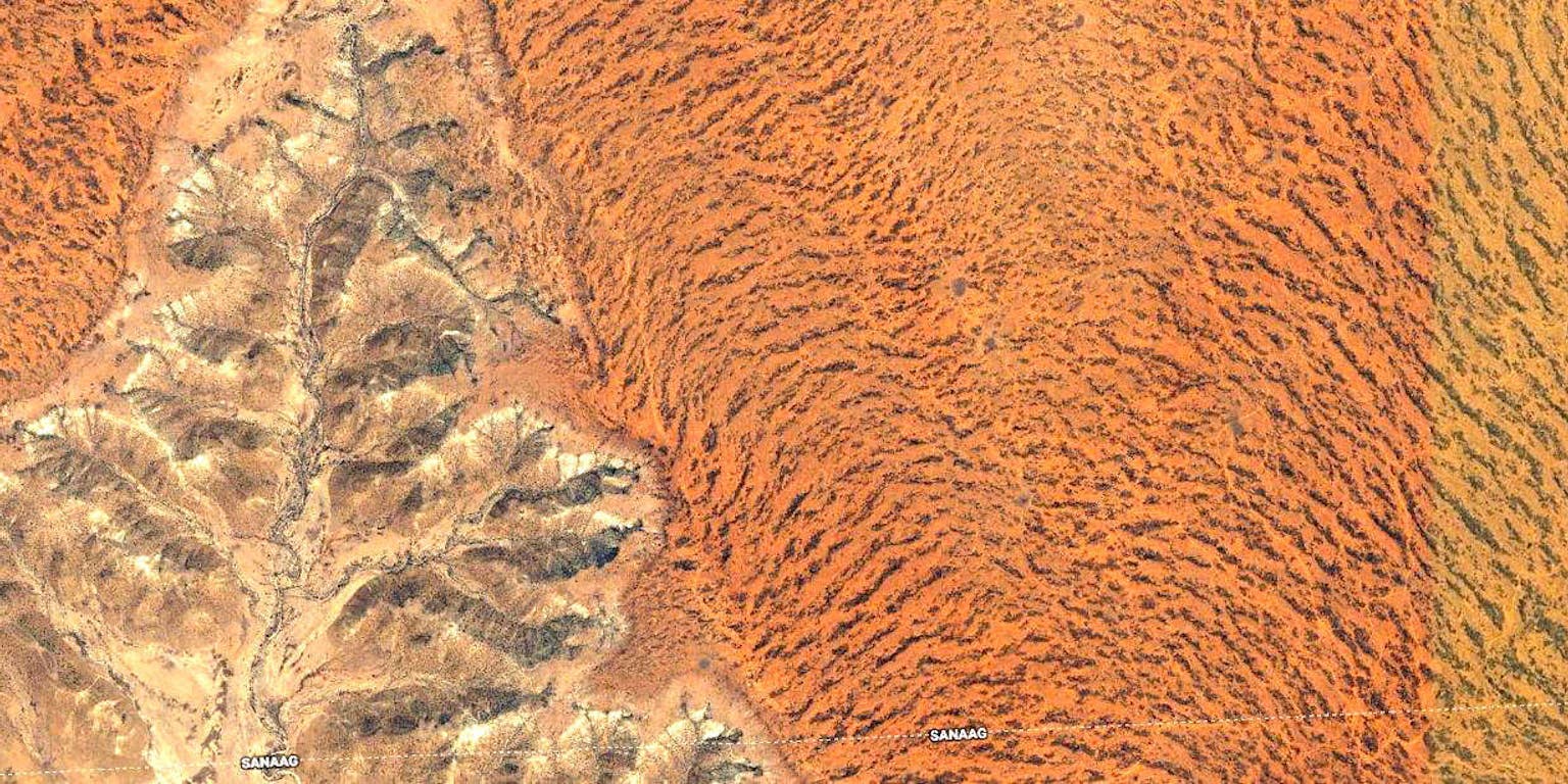 Satellietopname van de Sool-regio in Somalië, met vegetatie in een bandenpatroon. De afbeelding beslaat ongeveer 7 × 3 kilometer.