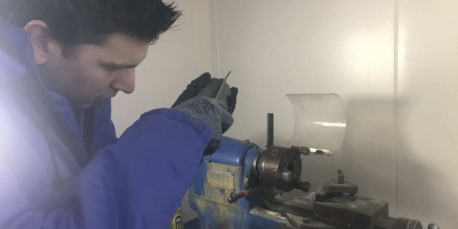 In de vriescel voelt het inmiddels steeds kouder aan. In het begin hield de overall me nog warm, maar langzaamaan worden mijn vingers gevoelloos. Ook mijn neus begint te tintelen. Zuidhoek plaatst het zand op het onderste deel van een soort enorme cocon, dat het monster zal omsluiten. De cocon lijkt wel wat op een bierfust. In de schil zitten allemaal buisjes. Die vullen zich straks met de olie. Dit geeft warmte af aan het zand in de kern, waardoor het langzaam ontdooit. Dit duurt ongeveer een dag. “Het is een tijdrovende klus om alles klaar te maken en het ontdooien doen we ook heel langzaam, zodat het zand dezelfde eigenschappen blijft houden als in Groningen”, legt Van Essen uit.