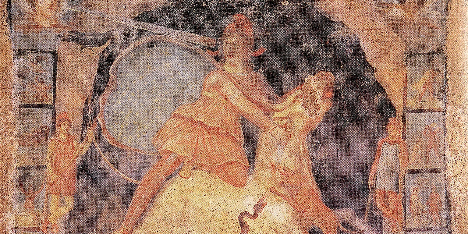 Hij was mogelijk gebaseerd op Mithra, een oude Perzische zonnegod. De cultus van Mithras was alleen toegankelijk voor mannen. Dit masculine karakter maakte de cultus erg populair bij Romeinse soldaten. Veel weten oudhistorici overigens niet van de Mithrascultus, omdat er geen geschreven bronnen over de mythologie achter Mithras bekend zijn. Uit de iconografie blijkt dat hij geboren is uit een rots. Op een zeker moment krijgt Mithras de opdracht (in sommige gevallen van Apollo) een stier te doden. Mithras drijft het beest een grot in en doodt het met een dolk. Deze scene (de ‘tauroctonie’) was in elk mithraeum, de ondergrondse plekken waar de Mithras-rituelen plaatsvonden, te zien.