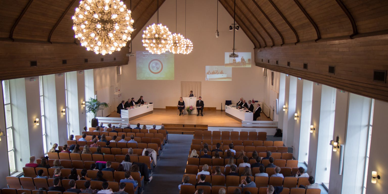 Na een kort introducerend praatje van Que voor het publiek vol met haar vrienden en collega’s, kwamen wij als opponenten netjes in een rij binnen. Als derde was ik aan de beurt om Que acht minuten lang met vragen over haar onderzoek uit te dagen. Ik opende met een officiële en ingewikkelde Engelse openingszin, die ik al weer grotendeels vergeten ben, maar hij begon met iets als ‘Esteemed candidate, based on my rights and privileges..enzovoort’. In elk geval geen handige openingszin voor andere situaties dan een verdediging. Verder complimenteerde ik Que met haar goede proefschrift. Daarna begon ik met de vragen op mijn lijstje. Que begon haar eerste antwoord op mij volgens de etiquette met ‘Esteemed opponent’, ofwel zeer geleerde opponent. En dankzij haar goede en uitgebreide antwoorden op mijn eerste drie vragen, bijvoorbeeld over hoe ze verder onderzoek naar haar onderwerp zou willen doen, vlogen de acht minuten om. De rector gaf aan dat het tijd was voor de volgende van de drie resterende opponenten. Na 45 minuten kwam de pedel binnen en was het ‘hora est’, het was tijd, de verdediging was gedaan.
