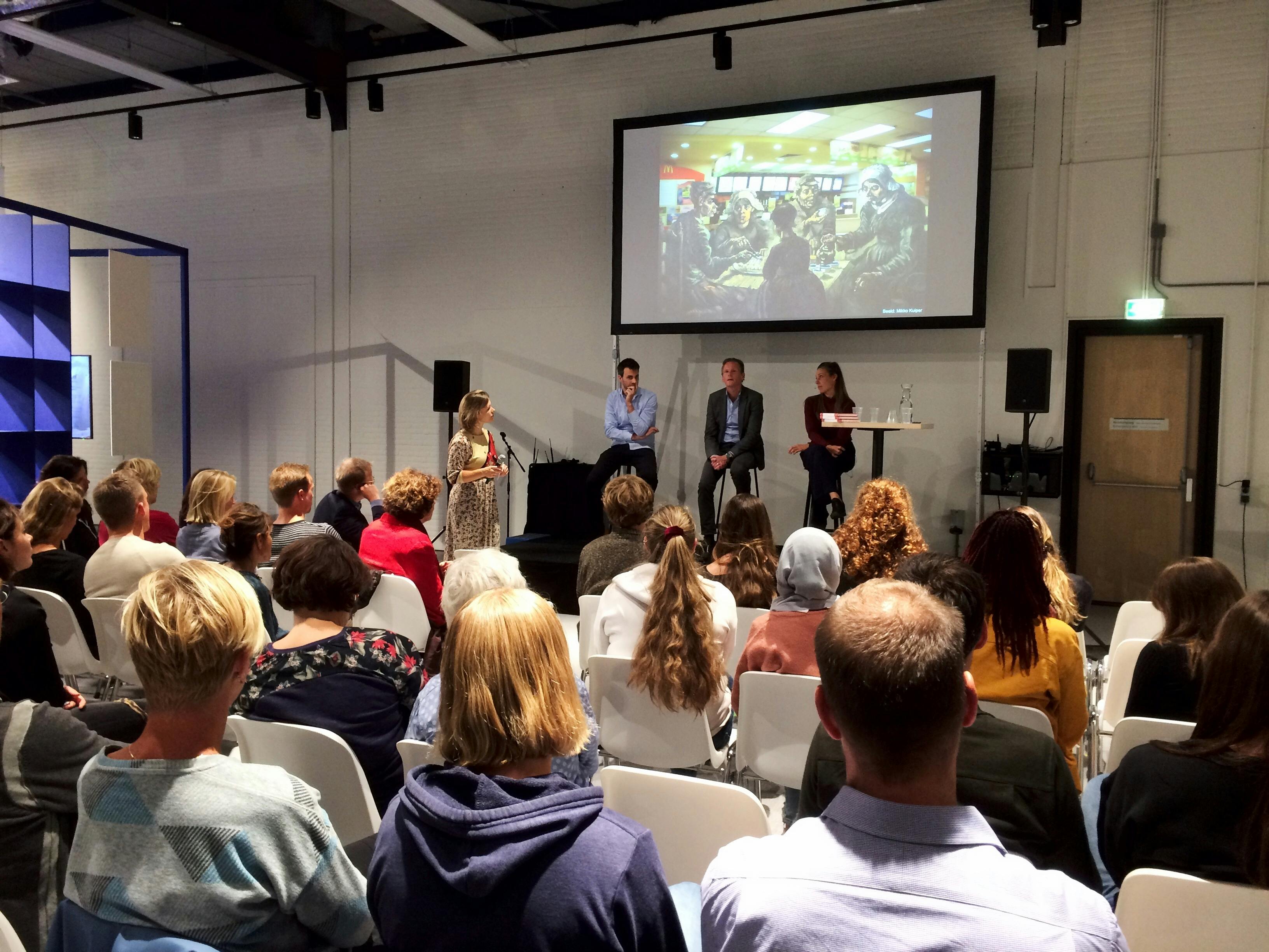 Het is druk in de NEMO Studio, waar de bezoekers eerst wat rondlopen in de tentoonstelling over kweekvlees, plofinsecten en genetische modificatie. Er worden zelfs stoelen bijgehaald om alle geïnteresseerden een zitplaats te geven. Desiree opent de avond met de vraag wie van zichzelf vindt dat hij of zij duurzaam bezig is met voedsel. Hierop gaan slechts een stuk of tien handen de lucht in. Maar wat verstaan we eigenlijk onder duurzaamheid? Weinig vlees eten, lokale voeding maar ook de ingewikkelde term ‘eiwittransitie’ (de overgang naar plantaardige eiwitten) wordt genoemd.