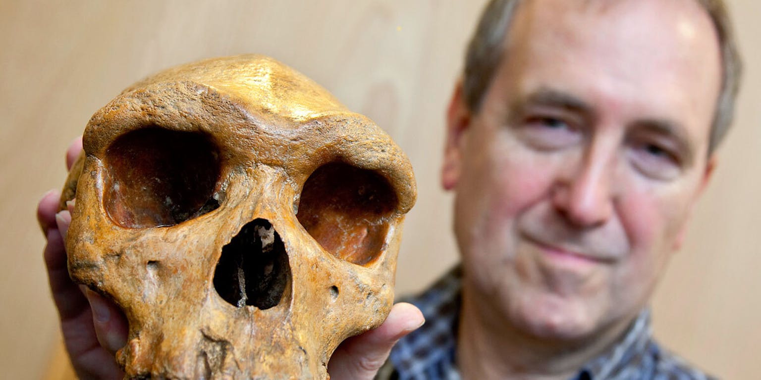 Chris Stringer met de schedel van Homo rhodesiensis (Rhodesian man), een van onze voorouders uit Afrika. De schedel werd in 1921 in het huidige Zambia gevonden.