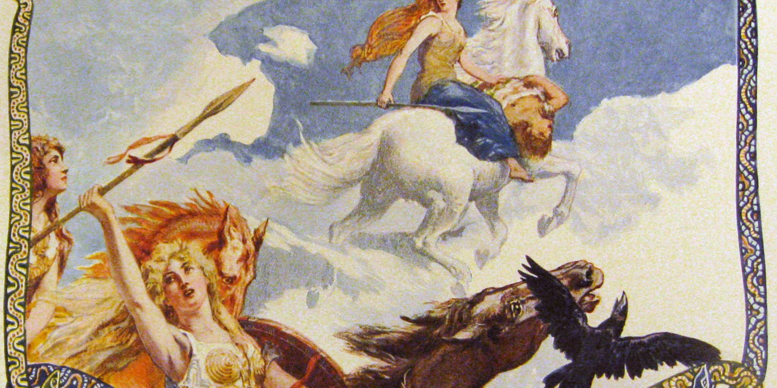 In de Noorse mythologie brachten de Walkuren dappere overleden Vikingstrijders van het slagveld naar het Walhalla (Emil Doepler, ca. 1905)