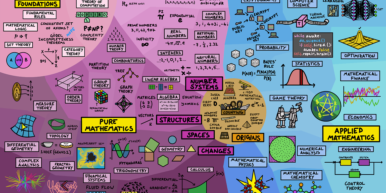 Op de middelbare school leer je vooral over de wiskunde in het midden van de kaart: vergelijkingen oplossen, de sinus en de cosinus, negatieve getallen en differentiëren en integreren. Als je goed kijkt is dit maar een heel klein deel van de kaart. Er ligt dus nog een heel gebied achter. Daarnaast zie je aan de rechterkant hoe breed te toepassingen van wiskunde eigenlijk zijn: van evolutie tot beurskoersen tot het beveiligen van je computer.