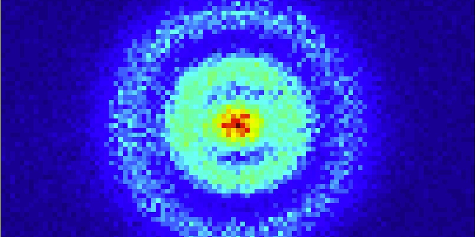 AMOLF/Aneta StodolnaHet bovenstaande plaatje is het resultaat. Het laat in lichtblauw de plekken in het atoom zien waar de kans het grootste is het elektron tegen te komen. Die kans blijkt het grootst te zijn in het midden, bij de roodgele punt. Dat is vlakbij de atoomkern ofwel het proton (die overigens zo klein is dat hij niet te zien zou zijn op deze schaal). Daaromheen zit een relatief groot gebied waar het elektron met regelmaat gevonden wordt. Dan is er een zone waar de vindkans tot nul zakt, om vervolgens in een ringvormig gebied weer groter te worden. Deze zone’s zijn te vergelijken met een golf waarin buiken en knopen zitten, en die bovendien door de quantummechanica worden voorspeld.