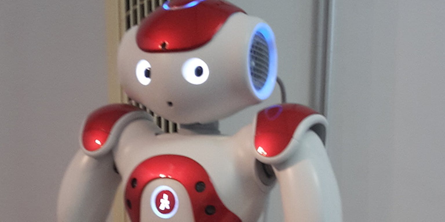 Mathilde Jansen voor NEMO Kennislink via CC BY-NC-SA 2.0Ook de spraakherkenning van de robot werkte nog niet goed. Die systemen zijn vooral getraind op volwassen stemmen en ook nog eens meer op mannen dan op vrouwen. “Hoge kinderstemmetjes die grammaticaal nog niet helemaal kloppen, zijn daarom nogal een uitdaging”, zegt de kersverse doctor. Daarom werkte de robot uiteindelijk zonder spraakherkenning. De robot werd gekoppeld aan een tablet en reageerde op de taakjes die de kinderen uitvoerden op de tablet.