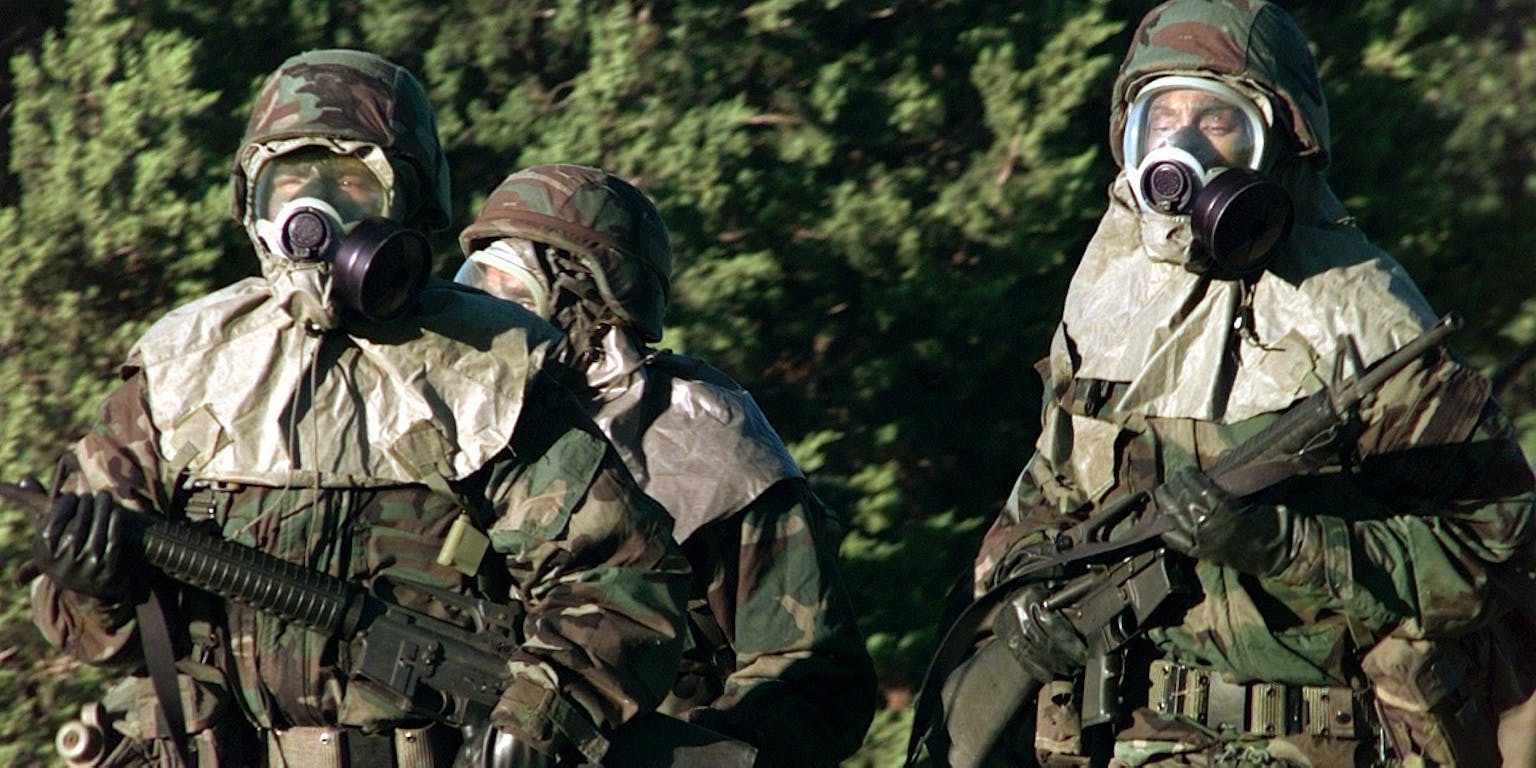 Amerikaanse soldaten in MOPP 4 tenue (Mission Oriented Protective Posture), het hoogste niveau van bescherming tegen chemische wapens
