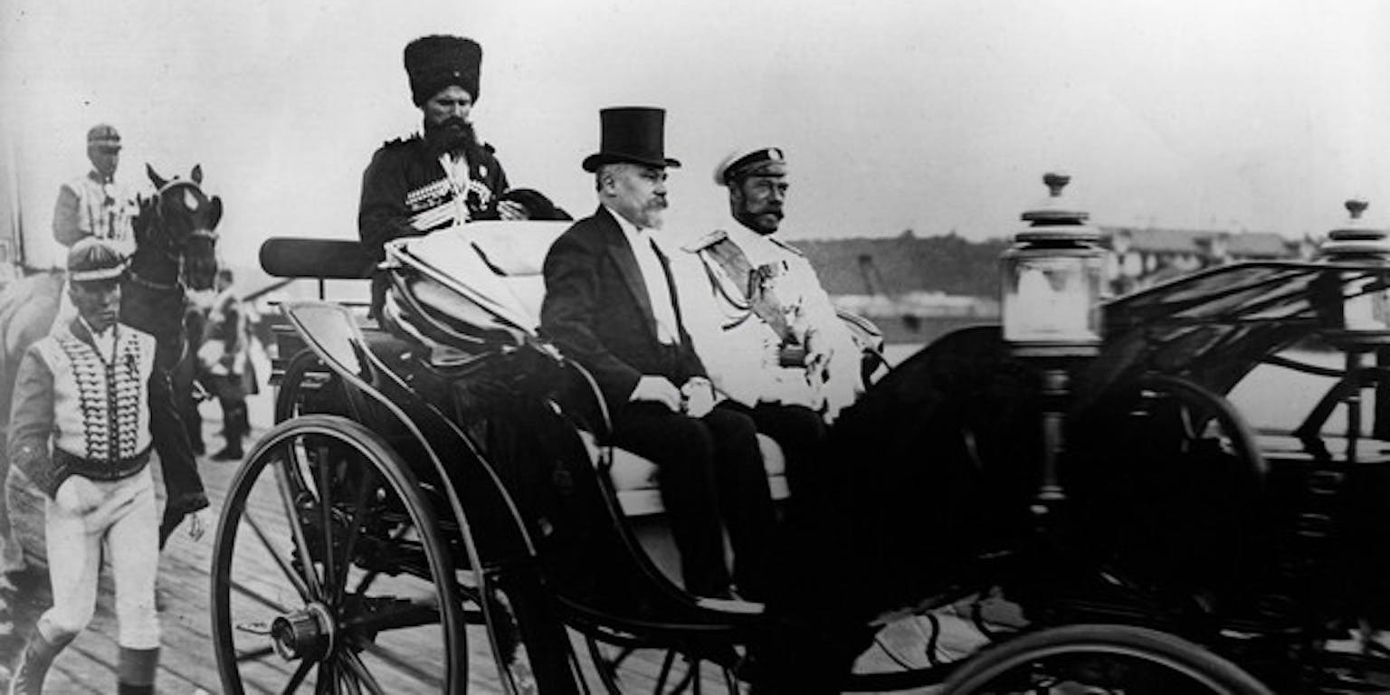 De Franse president Raymond Poincaré rijdt samen met de Russische tsaar Nicolaas II in Sint Petersburg.