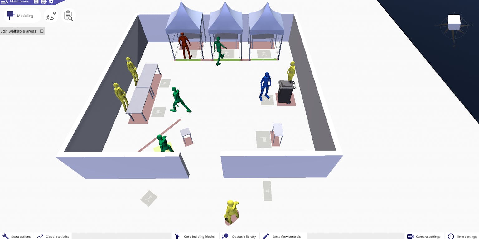 “We hebben een computerprogramma ontwikkeld dat de bewegingen van mensen simuleert, waarmee we ook de gevolgen van afstand houden nabootsen. Daarmee voorspel je hoe iemand zich gaat gedragen. Voor allerlei plekken, zoals een stembureau, rekenen we vervolgens door hoe mensen die binnenkomen zich gaan gedragen. Dit onderzoek deden we voor het ministerie van Binnenlandse Zaken. We hebben hetzelfde gedaan voor het station St. Pancras in Londen en een stadskantoor in Utrecht. Zo gaan we na hoe je dit soort plekken het beste inricht. Welke looproutes zijn handig, waar plaats je bankjes? Ook voor festivals en sportwedstrijden doen we dit soort onderzoek.”