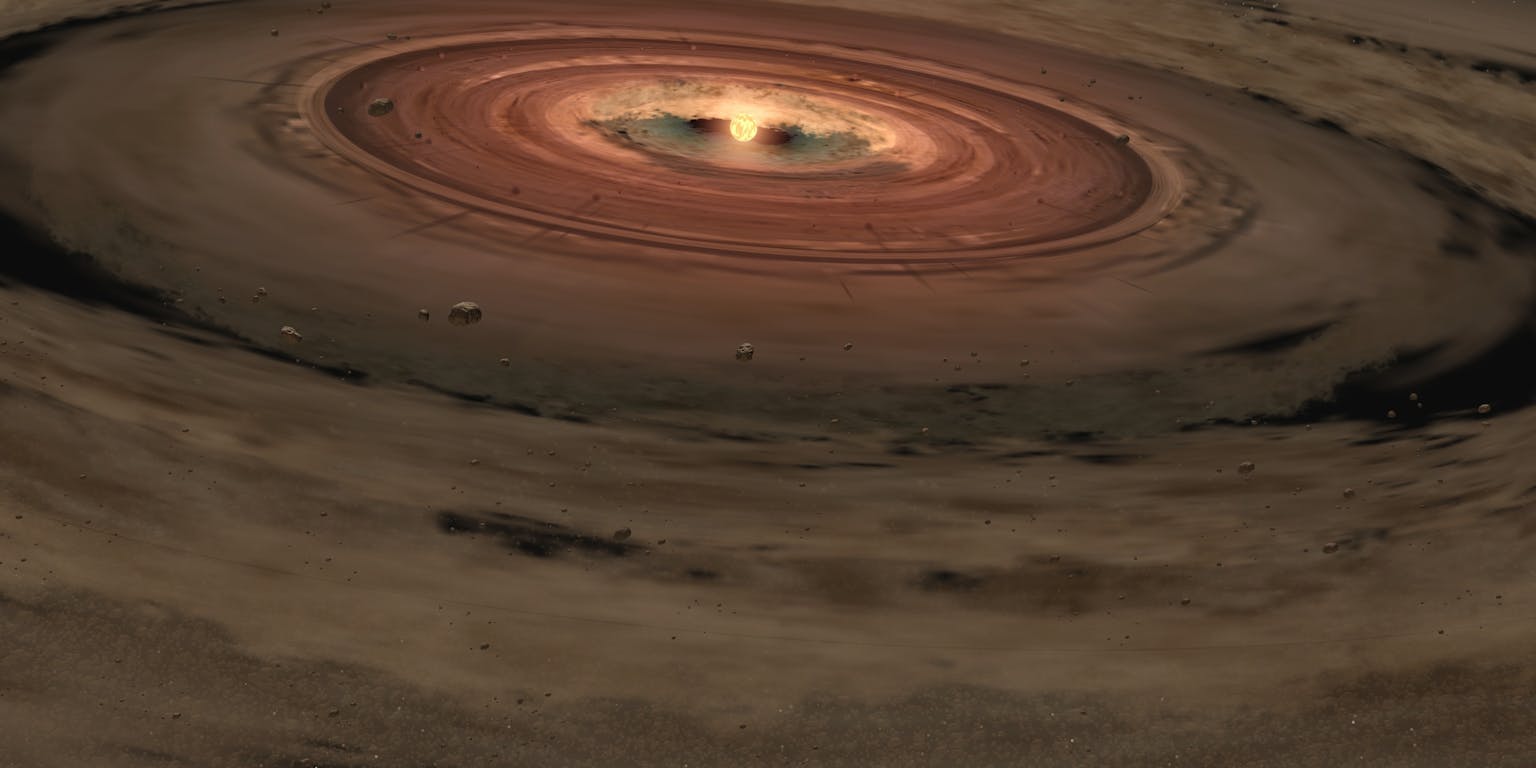 Een illustratie van een schijf. Planeten ontstaan uit de resterende moleculaire wolk waaruit de ster is ontstaan. Binnen deze schijf bevinden zich de fundamentele elementen die nodig zijn voor planeetvorming en potentieel leven.