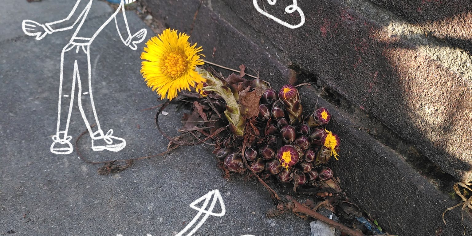 De stralend gele bloem van een klein hoefblad lacht mij toe vanuit de stoeprand naast de snackbar. Het lijkt misschien vreemd, zo vroeg in het jaar, maar er bloeit al van alles op straat. Het is ook alweer licht als ik ‘s ochtends op de fiets stap naar het station. Terwijl ik de hoek om sla bij de snackbar kijk ik vlug even of er al meer bloemen uitkomen. Als het warm genoeg is, stralen de goudgele zonnetjes me al tegemoet tussen de straatstenen, een goede start van de dag. Helaas gebeurt dat nu pas later in de middag als ik aan het werk ben achter mijn bureau.